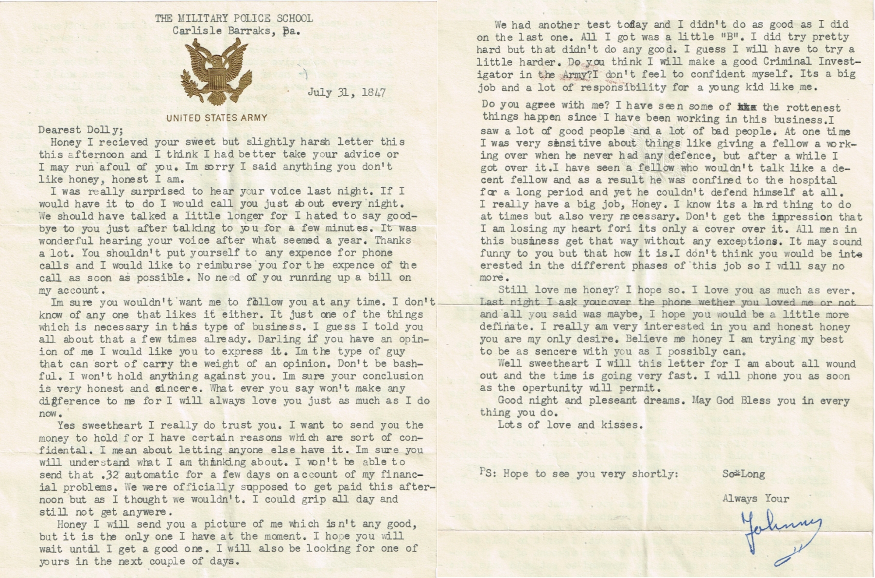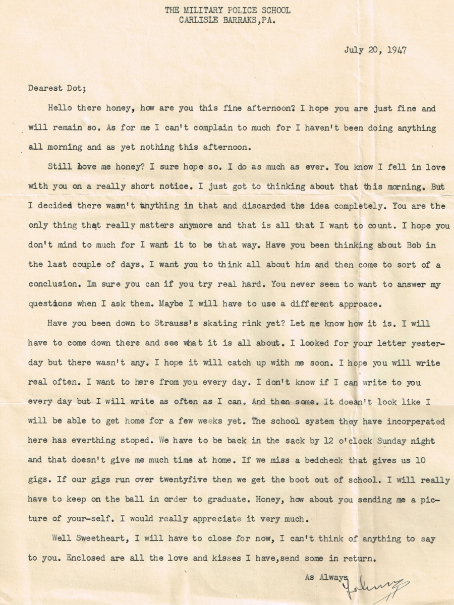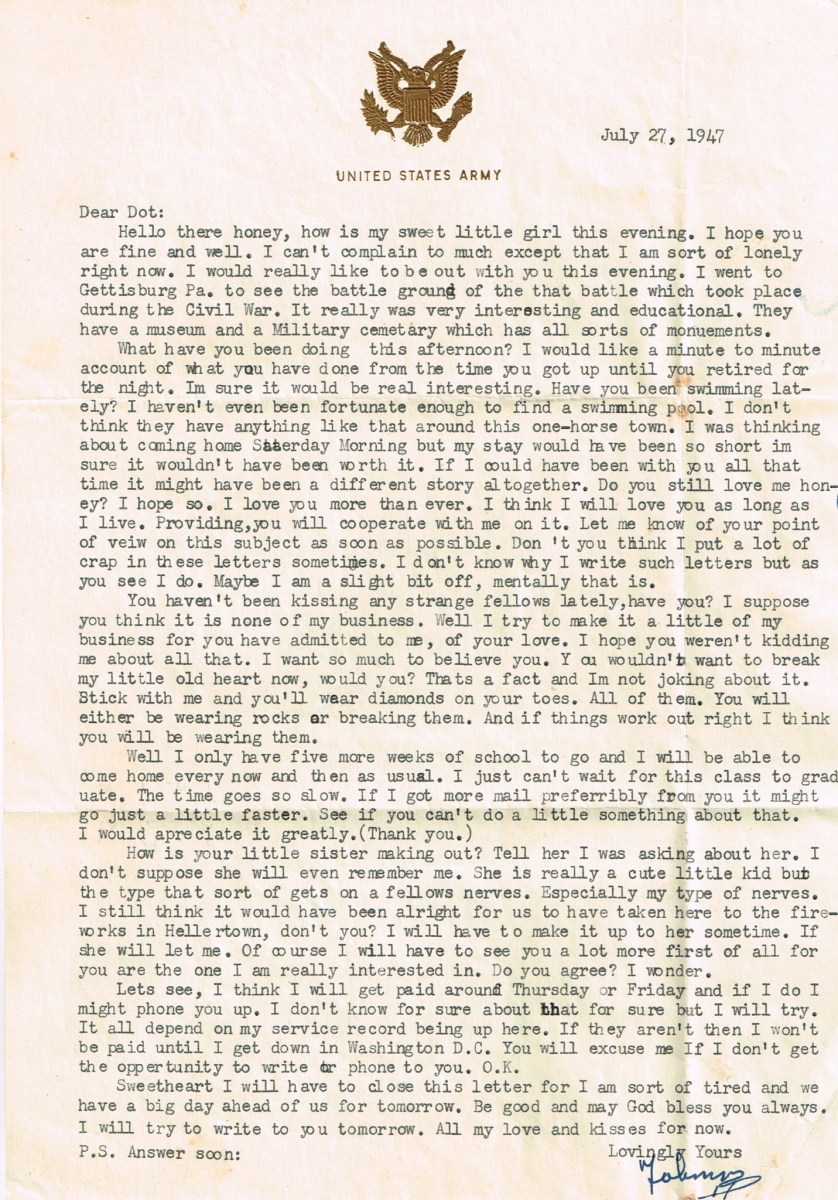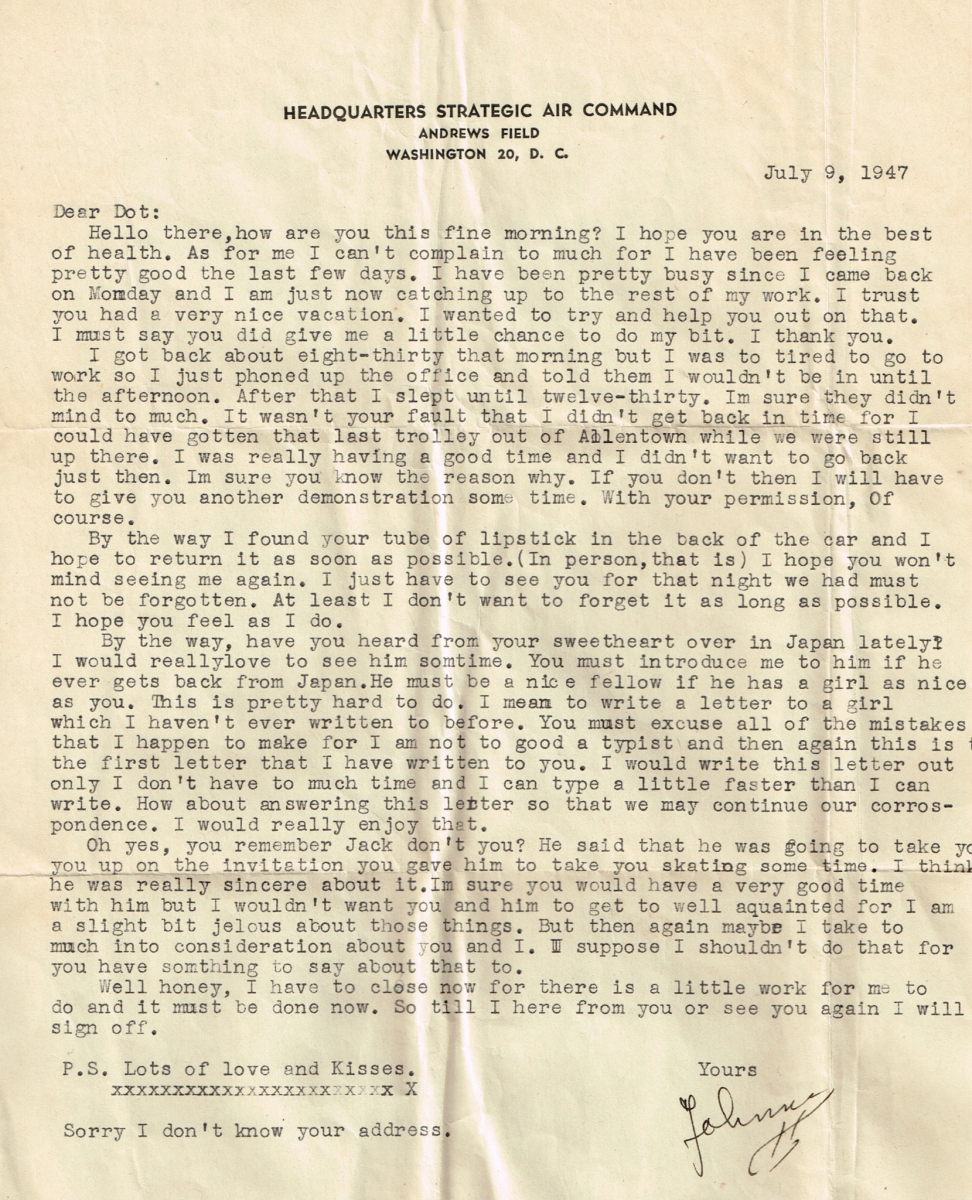 Letters Among the pile of old photo albums I found a trove of letters between Mom and Pop, written when he was in the service. Some of these are absolute gold. Pops Letters » Letters 47-07 Related Images: