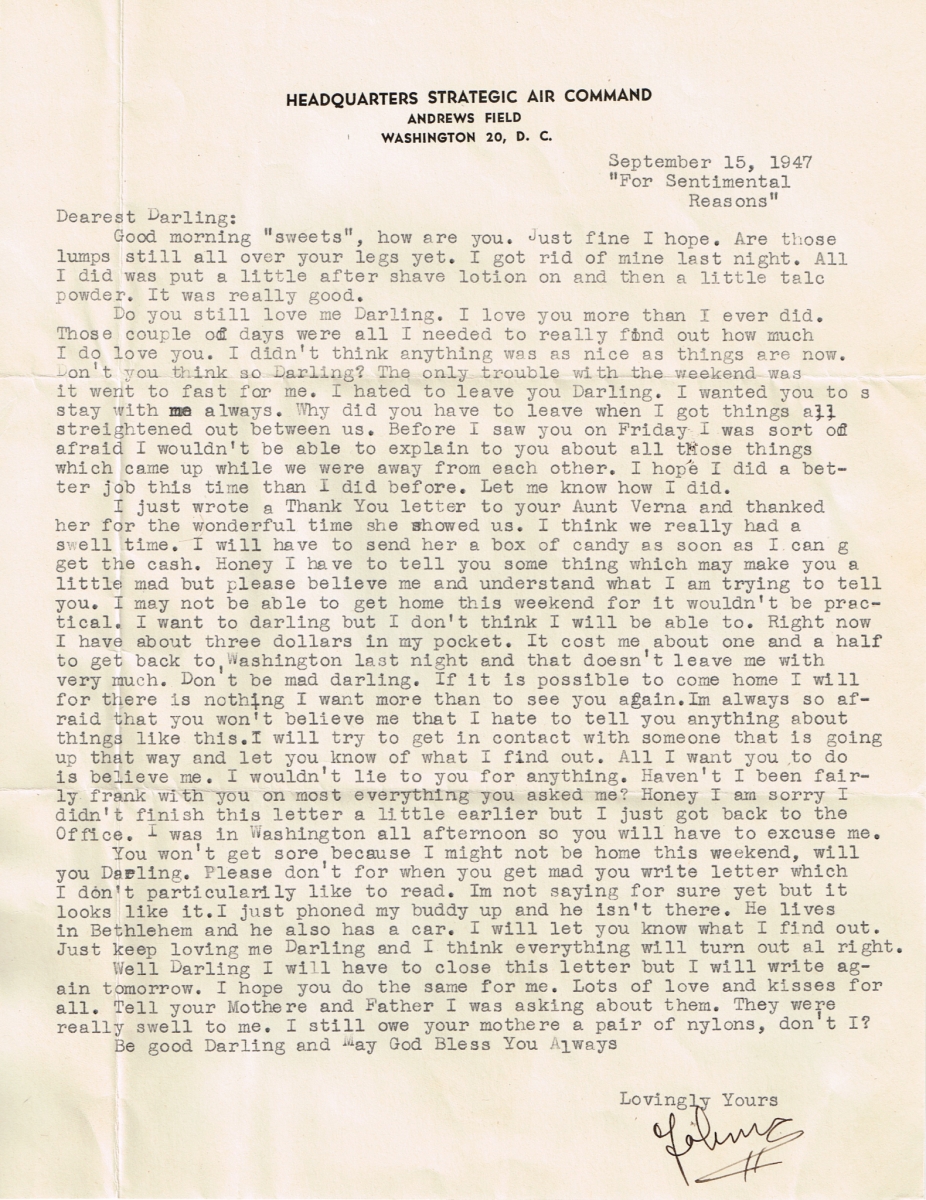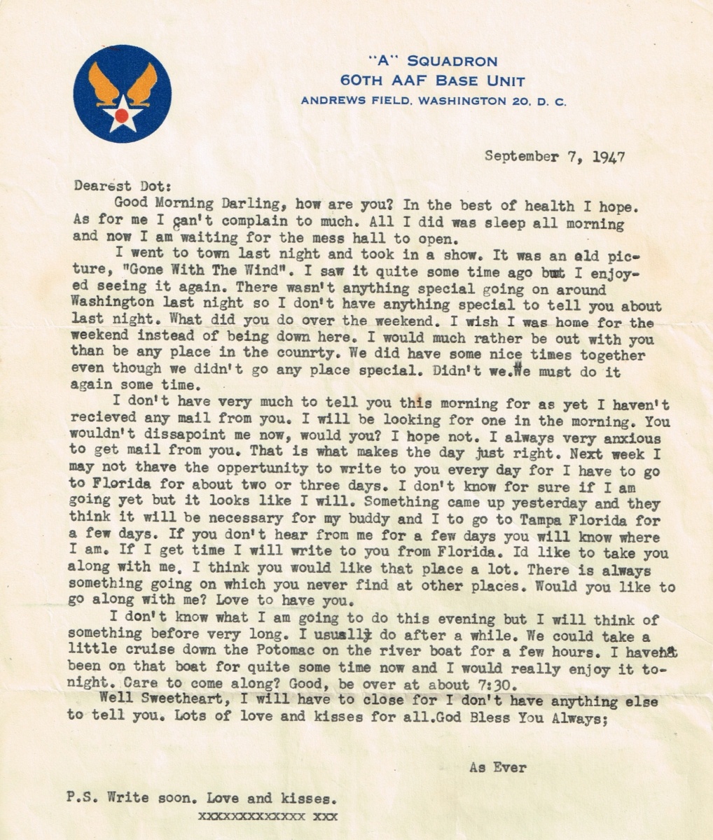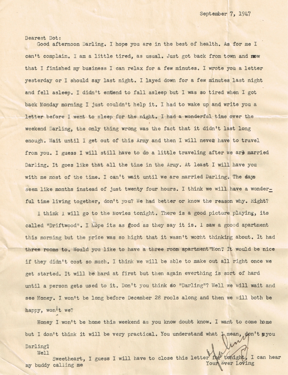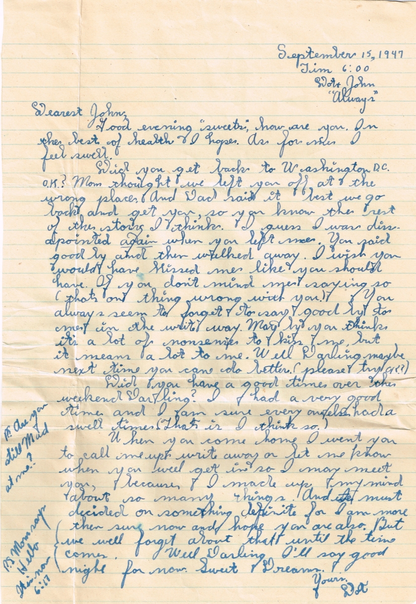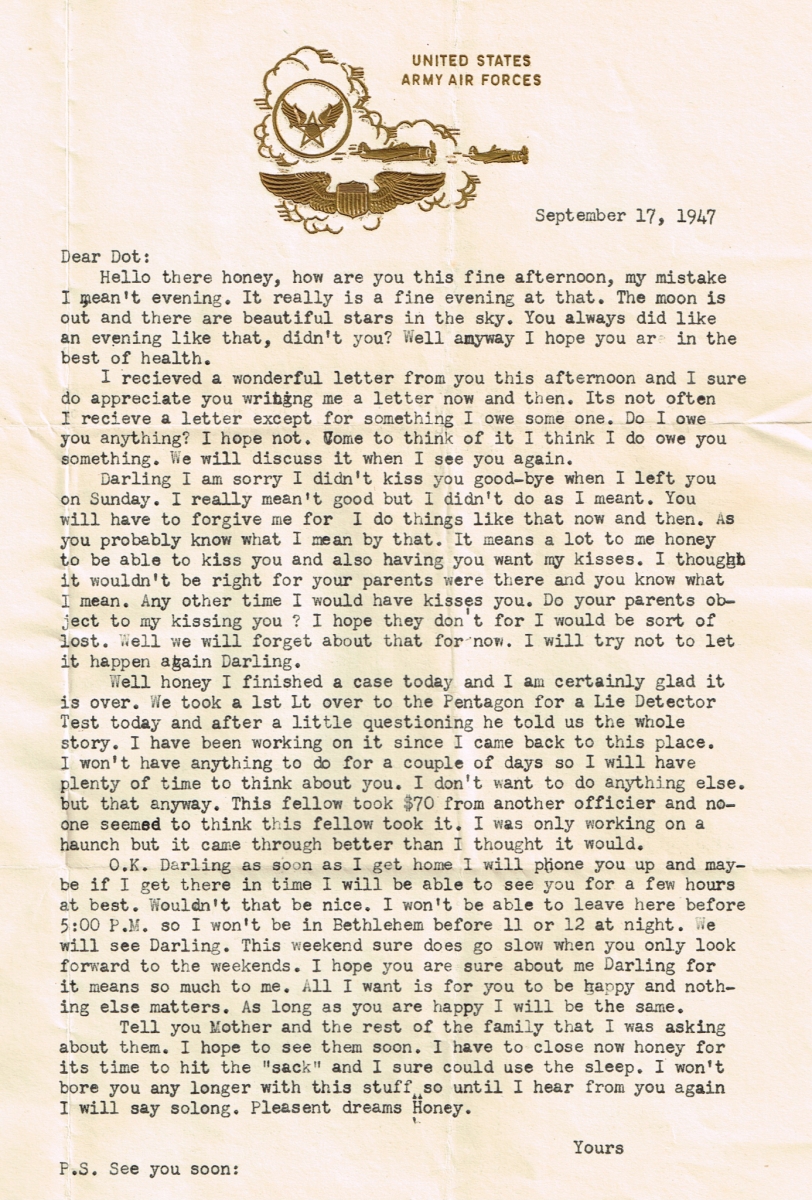 Letters Among the pile of old photo albums I found a trove of letters between Mom and Pop, written when he was in the service. Some of these are absolute gold. Pops Letters » Letters 47-09 Related Images: